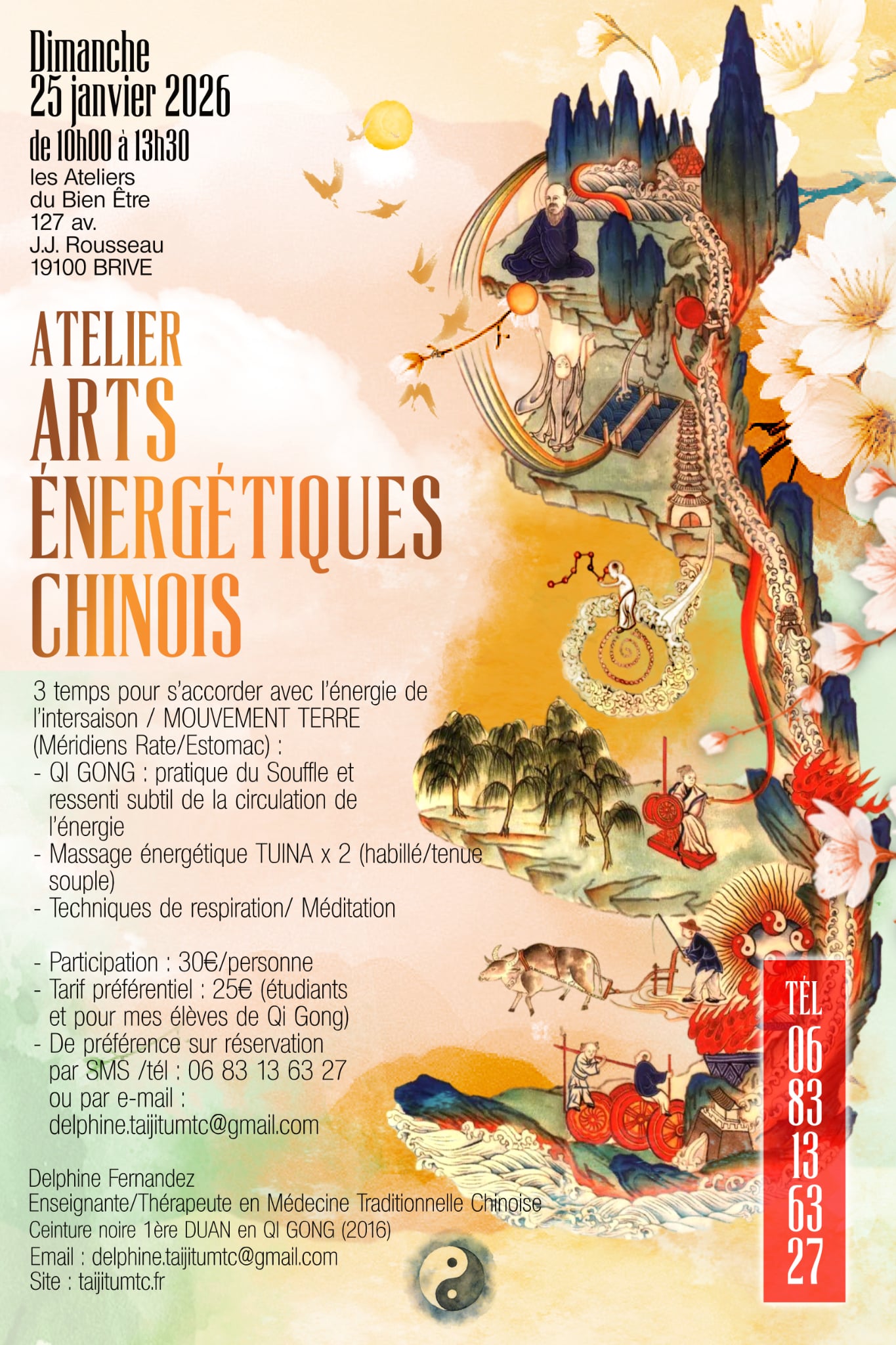 Atelier de 3H30 : 1h de QI GONG / 2h de pratique de MASSAGE TUINA / 20 mn de relaxation méditative.